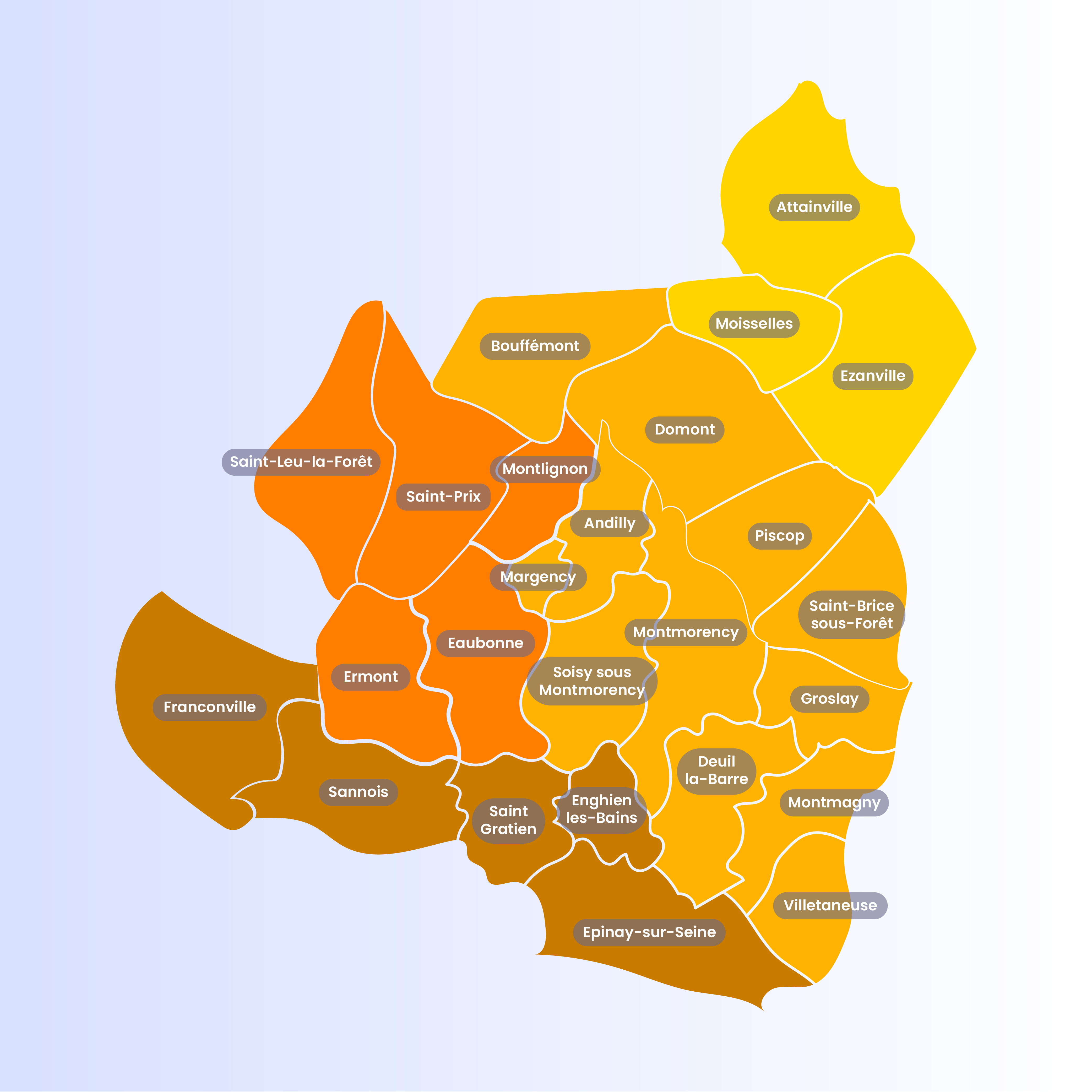 Montlignon, Montmagny, Montmorency, Piscop, Saint Gratien, Saint-Brice-sous-Forêt, Saint-Leu-la-Forêt, Saint-Prix, Sannois, Soisy-sous-Montmorency...